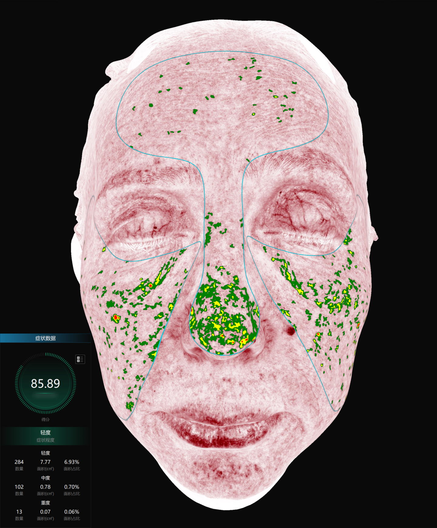 陈丽医师用以色美科肌肤影像分析仪讲解真实案例,教你用3D多光谱影像图读懂玫瑰痤疮,从表皮层到真皮层,把玫瑰痤疮的皮套“扒”下来。并且,以色美科肌肤影像分析仪搭载了皮肤垂类AI大模型,AI智能检测给皮肤问题综合打分,然后将症状部分圈出来,量化症状严重程度,为玫瑰痤疮精准诊疗提供辅助。