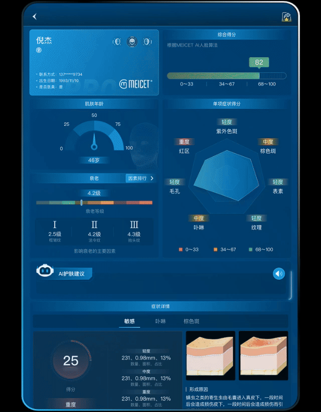 基于面诊检测数据,以色美科肌肤影像分析仪的AI报告生成针对性建议,将皮肤问题按严重程度排名,精准定位皮肤首要解决的问题,挖掘潜在需求,并智能关联门店项目,弱化了推销感,让求美者更容易接受项目设计,加速个性化方案快速落地。