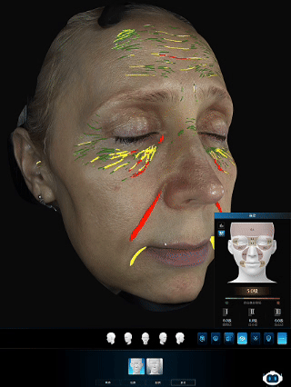 采用高精度结构光相机,真实还原皮肤纹理,结合东亚美学标准量化面部形态,支持360°光源拖动,精准识别下垂、凹陷等问题。以及搭载皮肤垂类AI大模型通过标记数据训练模型,智能精准捕捉皮肤症状,量化分析面积、数量等参数,术后还提供可追溯、可量化的效果验证。