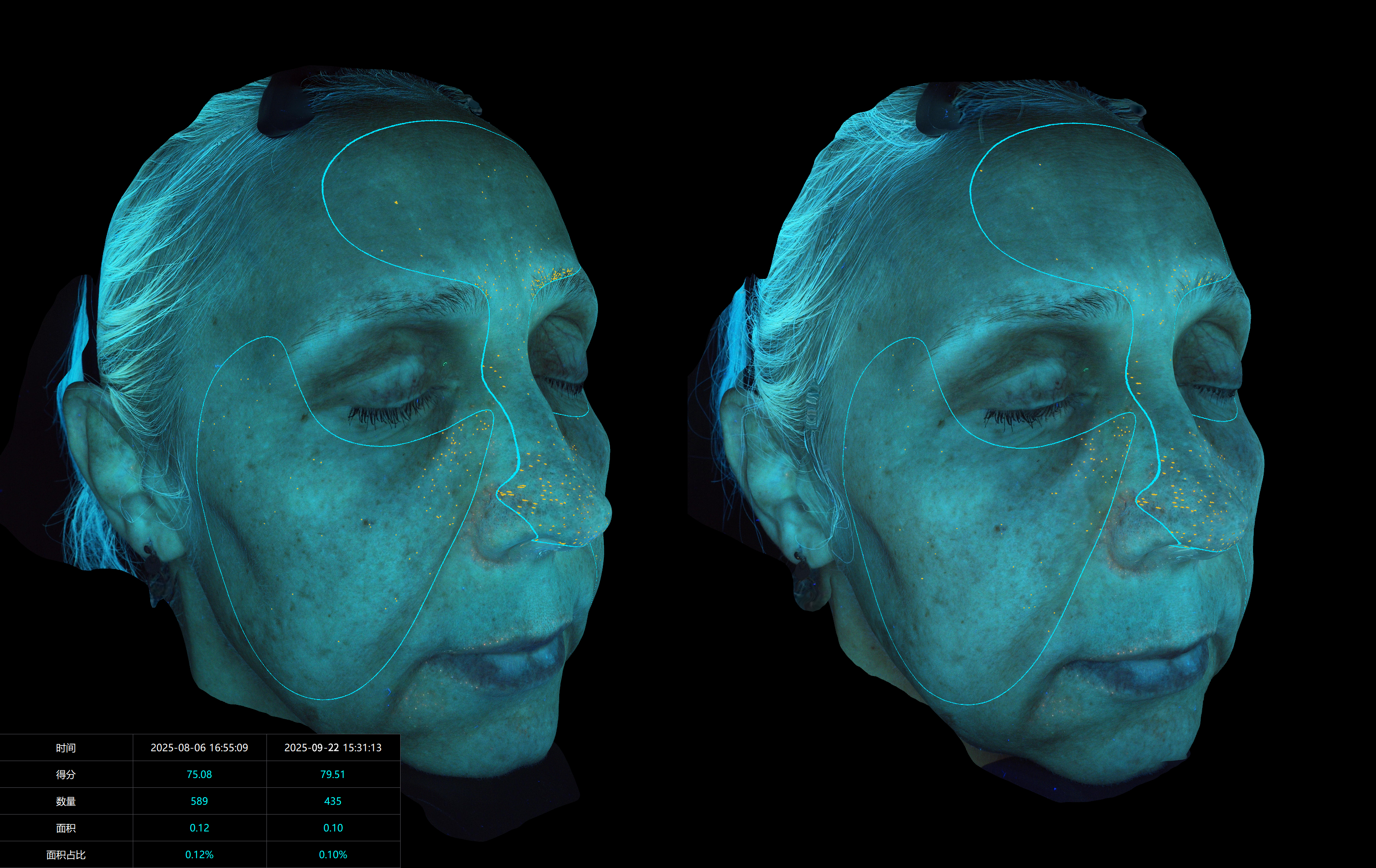 进入两图对比模式,系统左下角会出现术前术后的两次数值的对比框,包括:毛孔\纹理\油脂的总体打分、数量、面积、面积占比,几个维度清晰呈现肤质改变的效果。