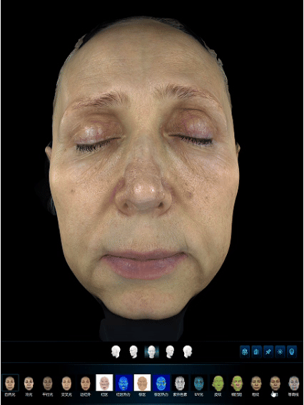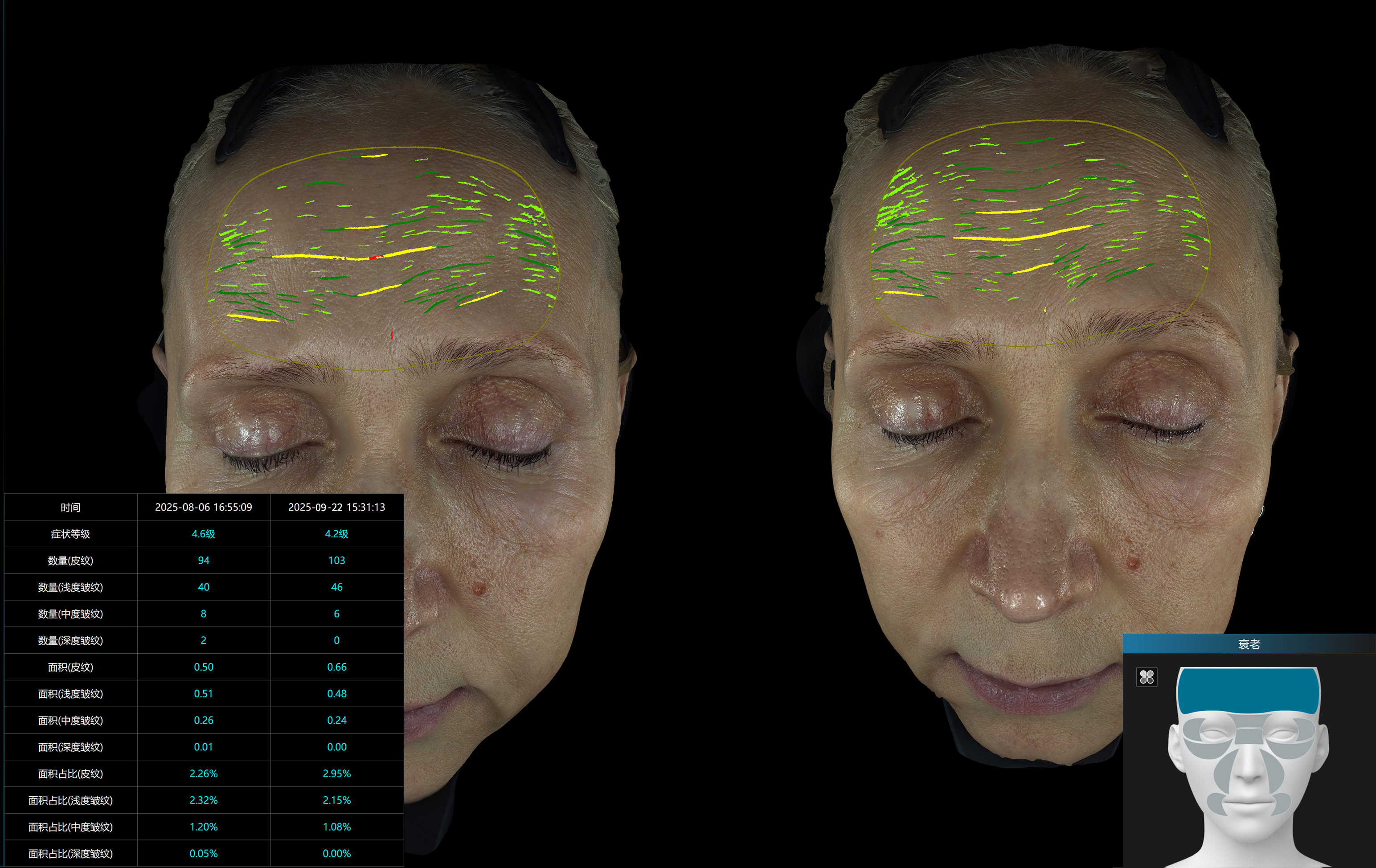 面部衰老精细划分为7个区域,进入两图对比模式,选择不同部位,系统左下角会出现术前术后两次数值的对比框,再加上皮肤老化常见的问题——色素(棕色斑量化对比),形成对抗衰效果的全维分析对比。